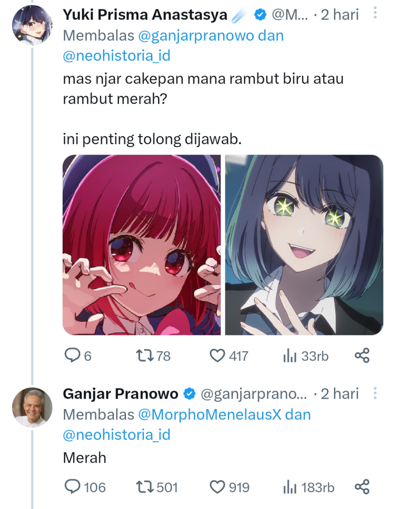Lalu pada 20 Januari lalu, seorang warganet di X menanyakan suatu hal terkait anime Oshi no Ko. Dia menanyakan siapa waifu pililhan pak Ganjar dari anime tersebut, “mas njar cakepan mana rambut biru atau rambut merah? ini penting tolong dijawab.” Dan tak disangka-sangka, Ganjar pun membalas tweet tersebut dan menyatakan memilih merah yang merujuk pada karakter Arima Kana.