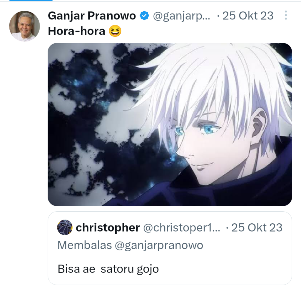 Lain hal nya dengan capres no urut 03 ini. Ganjar Pranowo beberapa kali membalas cuitan orang lain mengenai hal-hal berbau anime, walaupun beliau sendiri sepertinya tidak menonton. Seperti contohnya pada 25 Oktober lalu, seorang warganet membalas twit Ganjar “bisa ae satoru gojo.” Hal ini kemungkinan merujuk pada rambut beliau yang mirip karakter Gojo Satoru dari anime Jujutsu Kaisen. Ganjar pun megutip tweet tersebut dengan caption “Hora-hora”.