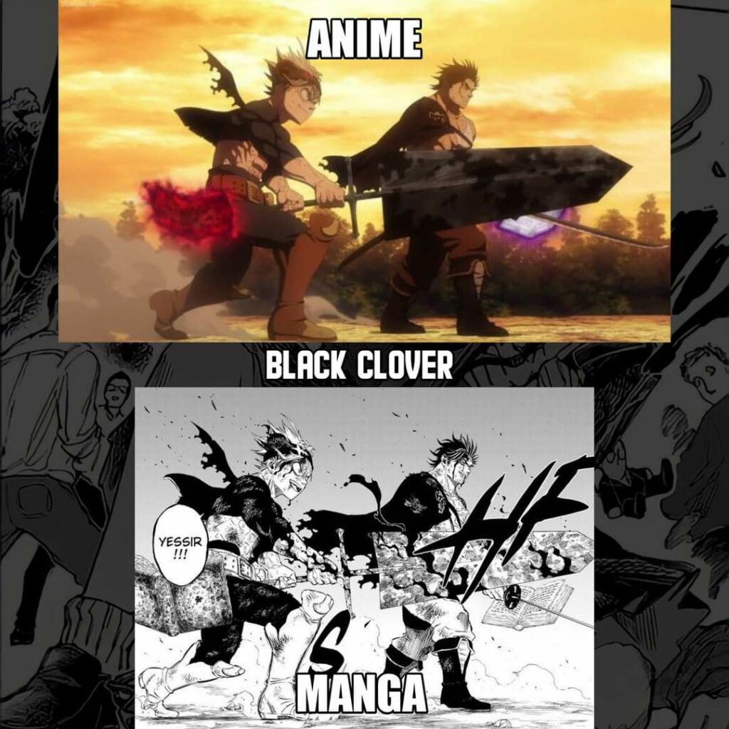 Yang terakhir adalah Black Clover, pada versi anime nya wajah Asta dan Yami tidak diperlihatkan dengan jelas memiliki luka. Tubuh pun mereka pun seperti tidak memiliki goresan berarti. Namun di versi manga-nya, sebenarnya wajah Asta dan Yami terlihat jelas memiliki luka. Ditambah tubuh pun mereka penuh dengan goresan dan lecet.
