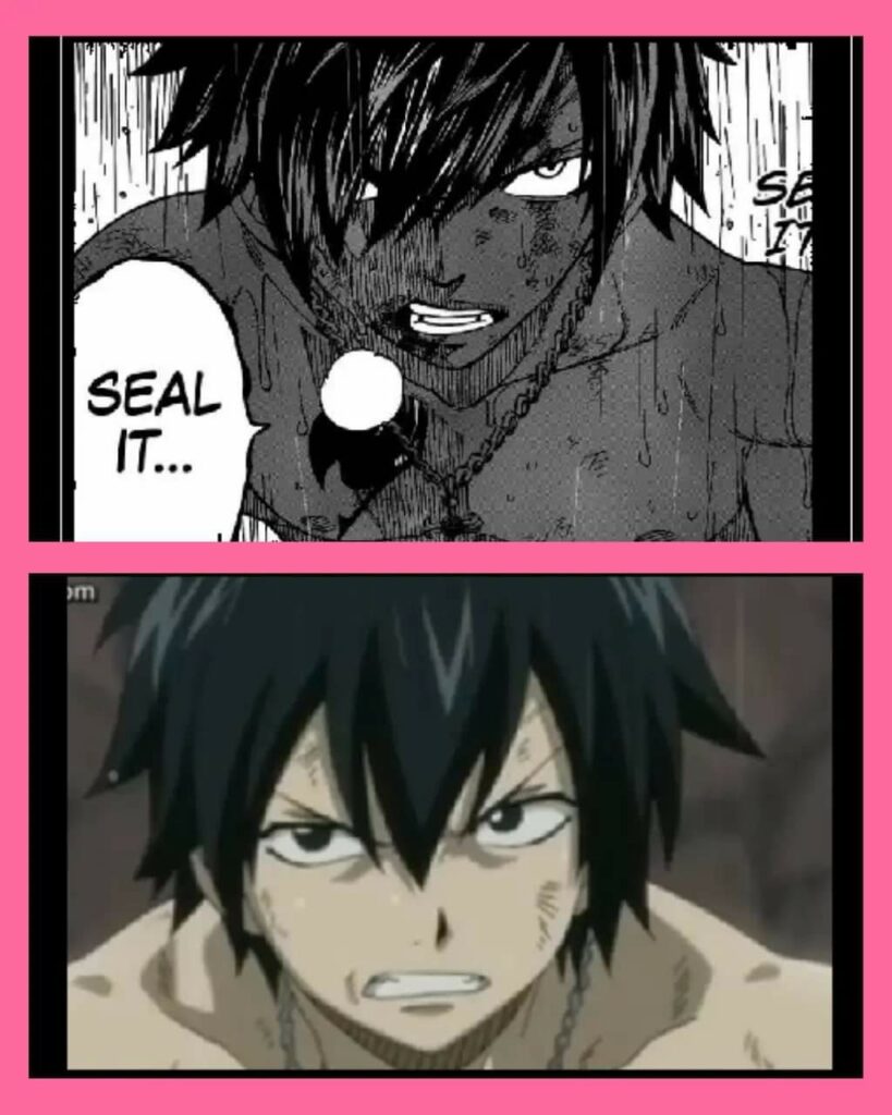 Perbedaan panel manga dengan anime pada Fairy Tail di atas, panel manga (atas) menggambarkan wajah Gray dengan lebih suram dan kelam, sedangkan penggambaran Gray di anime (bawah) lebih cerah.