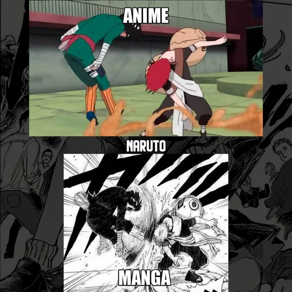 Lalu pada Naruto, saat karakter Rock Lee menendang kepala Gaara. Di anime, tidak ditunjukkan dengan signifikan saat Lee menendang kepala Gaara. Namun pada panel manga, terlihat dengan jelas bagaimana Lee menendang kepala Gaara.