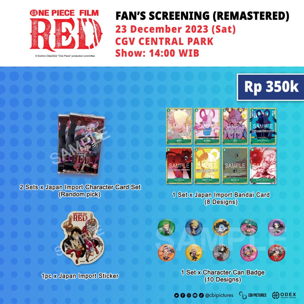 Dengan harga tiket 350 ribu rupiah, para penonton bisa mendapatkan berbagai merchandise. Berikut adalah merchandise untuk penonton Remaster One Piece Film Red: