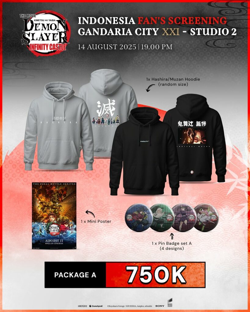 Movie Demon Slayer: Infinity Castle sudah resmi tayang di berbagai negara, dan bukan cuma filmnya saja yang jadi sorotan. Setiap region menghadirkan merchandise eksklusif yang bikin penggemar auto kalap. Dari hoodie, acrylic stand, sampai tiket edisi spesial—semuanya siap jadi buruan kolektor. Yuk, kita intip deretan merchandise resmi dari Jepang, Malaysia, Singapura, hingga Indonesia!