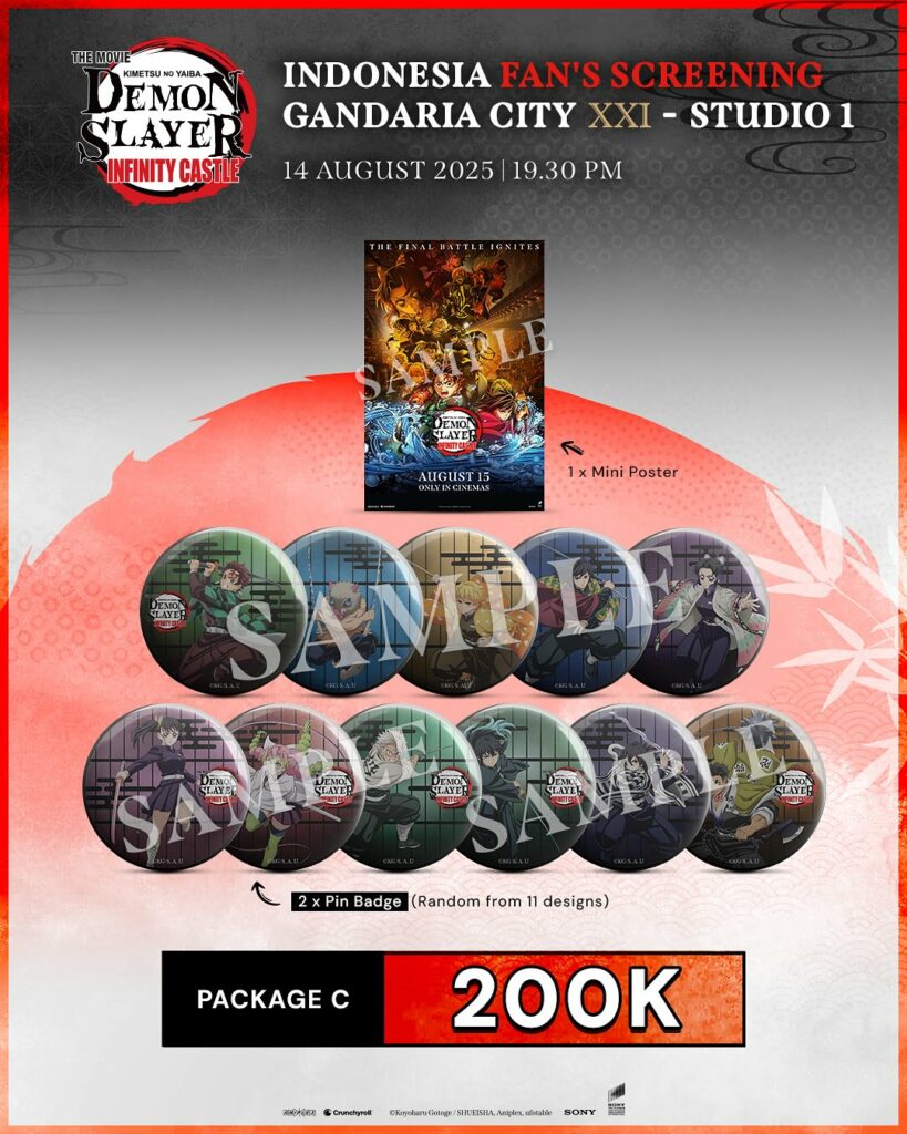 Penonton yang ikut screening eksklusif yang diadakan pada 16 Agustus 2025 lalu mendapatkan 1 set Demon Slayer: Infinity Castle Paper Coaster atau Kartu Pos (selama persediaan masih ada).