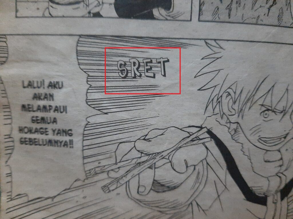 komik Naruto Bind Up Edition, SFX Jepang-nya tidak dihapus tetapi tetap diberi terjemahan kecil di sampingnya.