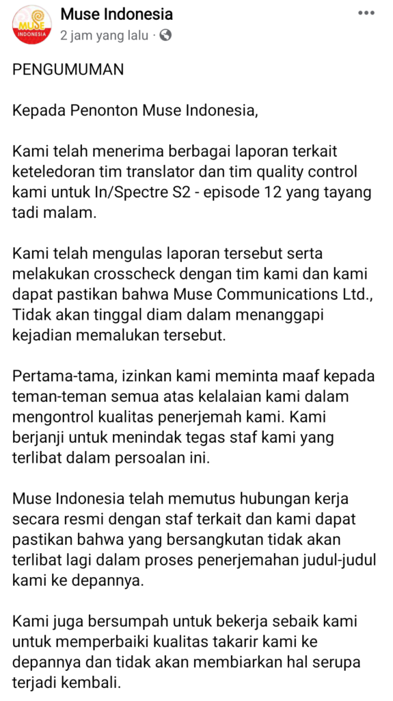 Episode ke-12 anime In/Spectre season 2 yang diunggah Muse Indonesia pada Minggu, 26 Maret di kanal Youtube mereka, membuat heboh para pecinta anime. Pasalnya, muncul dialog tak senonoh pada teks subtitle di episode ke-12 tersebut.