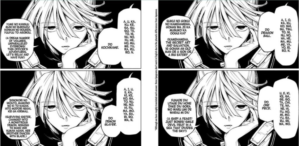 Isi cerita dalam manga tersebut sendiri sangat rumit, terkhusus bagi pembaca non-Jepang. Karena kode-kode yang digunakan adalah lipogram (permainan kata), menggunakan banyak suku kata bahasa Jepang yang sulit diterjemahkan ke bahasa Inggris. Terjemahan bahasa Inggris mentransliterasi suku kata, kemudian memberikan terjemahan artinya dalam tanda kurung.
