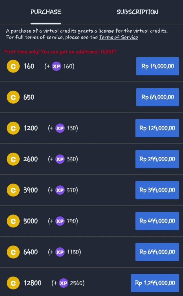Berikut adalah pricelist Coin dan bonus XP yang didapatkan: