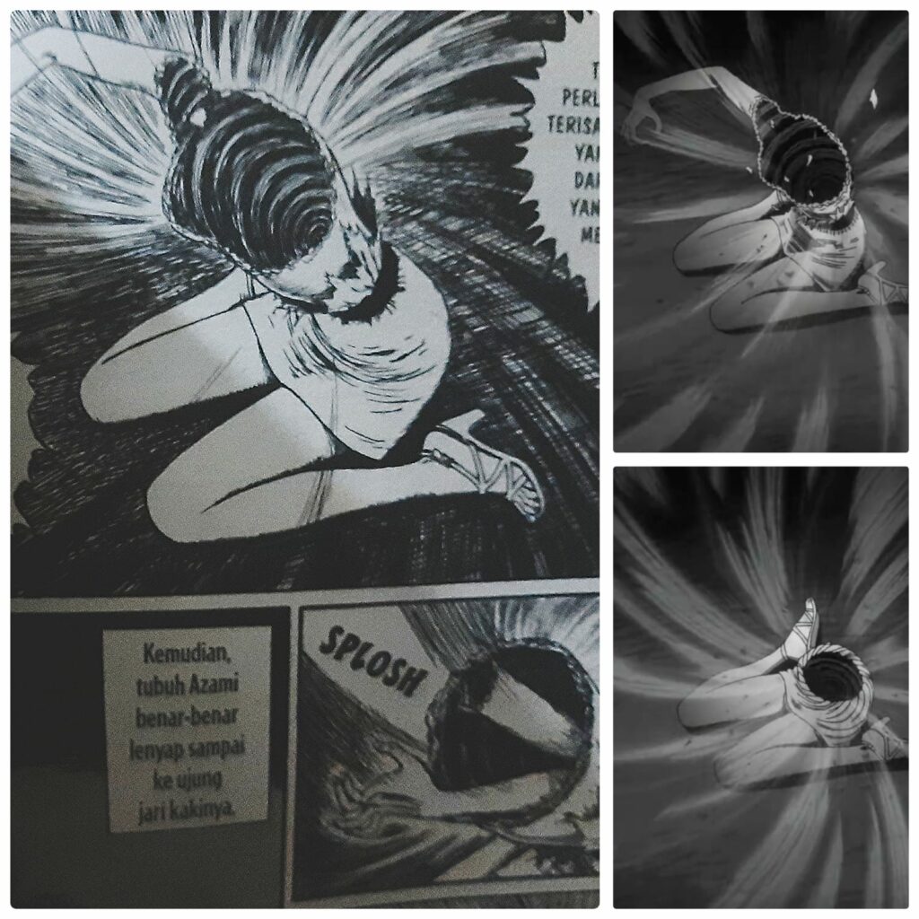 Salah satu kekuatan terbesar Uzumaki terletak pada kesetiaannya yang hampir total terhadap manga aslinya, namun justru kesetiaan ini menghadirkan tantangan tersendiri dalam medium animasi. Junji Ito, sang maestro horor, dikenal karena kemampuannya menyusun kengerian secara perlahan dan terperinci dalam medium statis. Hal ini diperlihatkan dengan gambar-gambar yang mengganggu dalam manga Uzumaki, di mana setiap panel memberikan waktu kepada pembaca untuk merenungi detail-detail disturbing yang secara halus namun pasti menggerogoti pikiran. Dalam transisi ke medium animasi, tantangan terbesar muncul ketika harus menerjemahkan kengerian yang secara alami berkembang lambat di halaman statis menjadi cerita yang mengalir lebih cepat di layar kaca.
