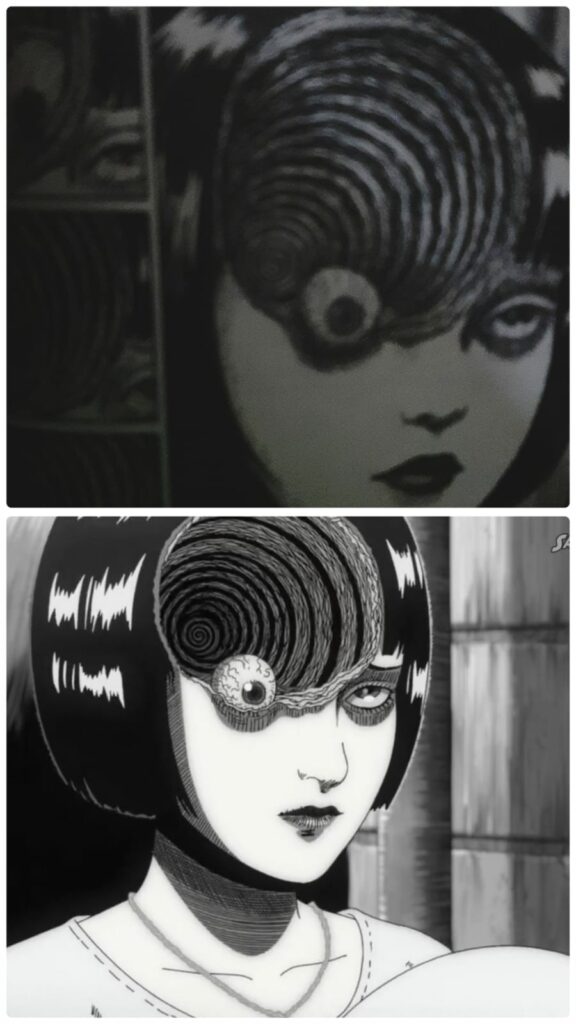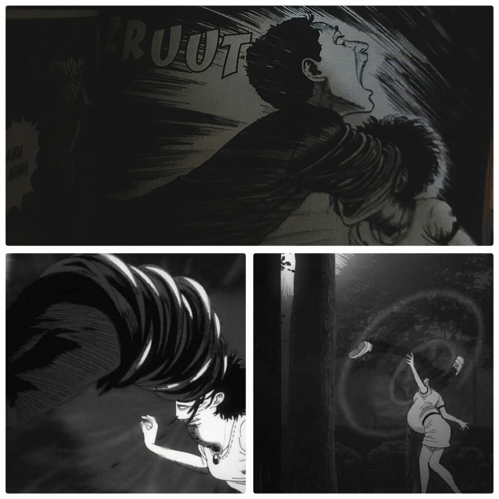 Episode ini juga berhasil menghidupkan salah satu bab awal yang sangat diingat penggemar, yaitu The Scar—kisah tentang seorang wanita yang perlahan-lahan menemukan bahwa bekas luka di tubuhnya berubah menjadi spiral. Di anime, animasi rotoskop yang digunakan untuk menggambarkan transformasi tubuh ini menambah suasana surreal yang menakutkan. Gerakan yang tidak wajar dan detail perubahan tubuh yang perlahan-lahan namun tak terhindarkan memberikan dampak visual yang menekan secara psikologis. Dalam manga, kita bisa mengamati bekas luka yang mengerikan dengan rinci, tetapi dalam anime, setiap detik transformasi ini dirasakan lebih hidup dan semakin mendekati absurditas horor yang khas dari Junji Ito.