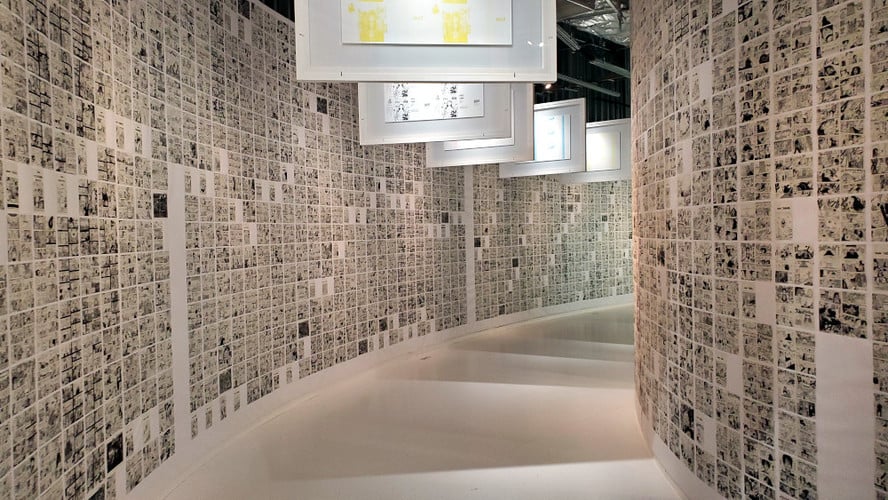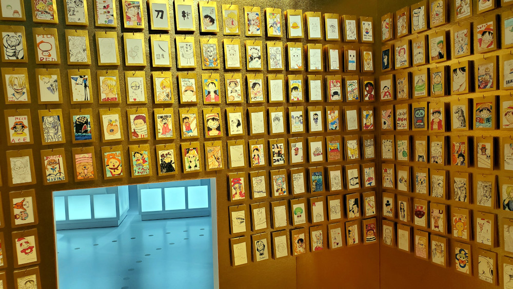 Saat area ini tidak digunakan untuk menggantung cetakan, para pengunjung akan disuguhi pemandangan spektakuler: dinding yang dipenuhi halaman manga dari berbagai tahun terbitan. Setiap bagian dinding menampilkan halaman dari dekade tertentu, memberikan gambaran perjalanan panjang manga tersebut sejak awal publikasinya.