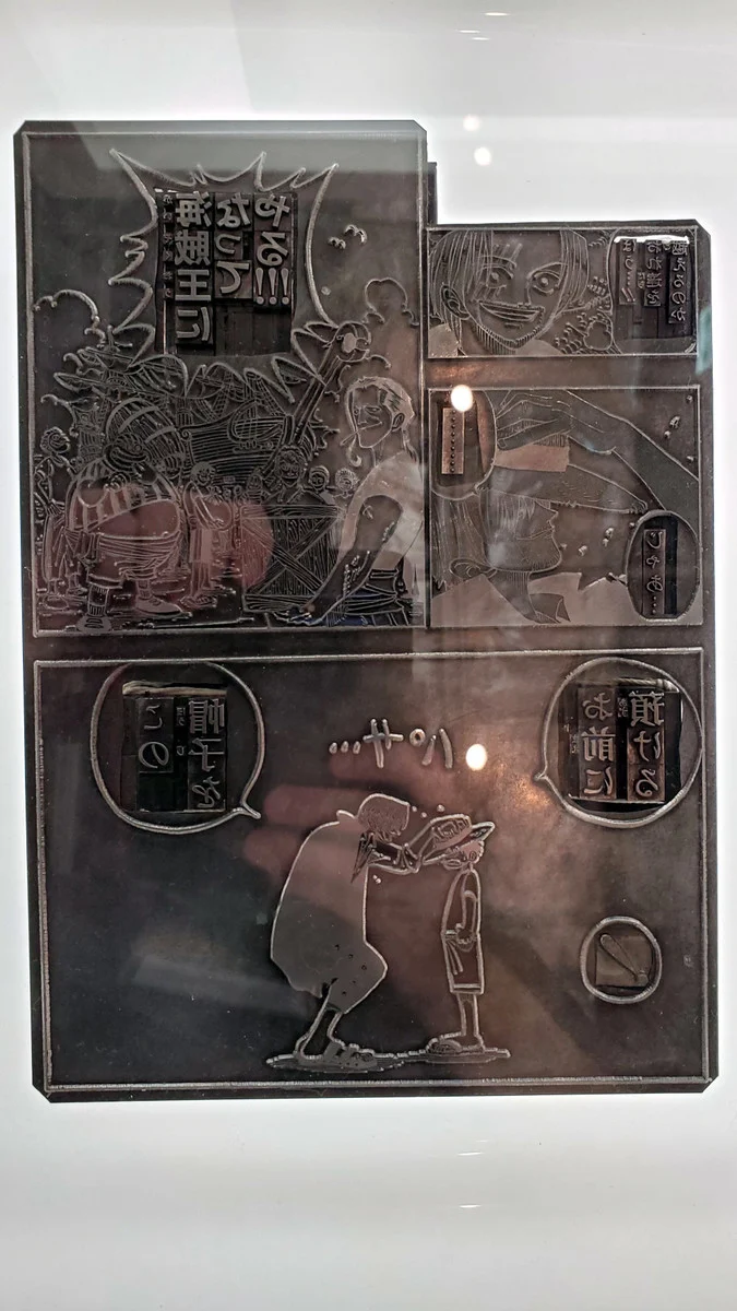 Pameran dimulai dengan ruang yang menampilkan berbagai teknik cetak. Di sini, pengunjung dapat melihat bagaimana seni cetak berkembang dari masa ke masa, termasuk cetakan inkjet penuh warna modern hingga cetakan letterpress menggunakan pelat logam khusus. Salah satu daya tarik utama adalah adegan ikonik Luffy dan Shanks yang dihidupkan kembali melalui teknik ini.