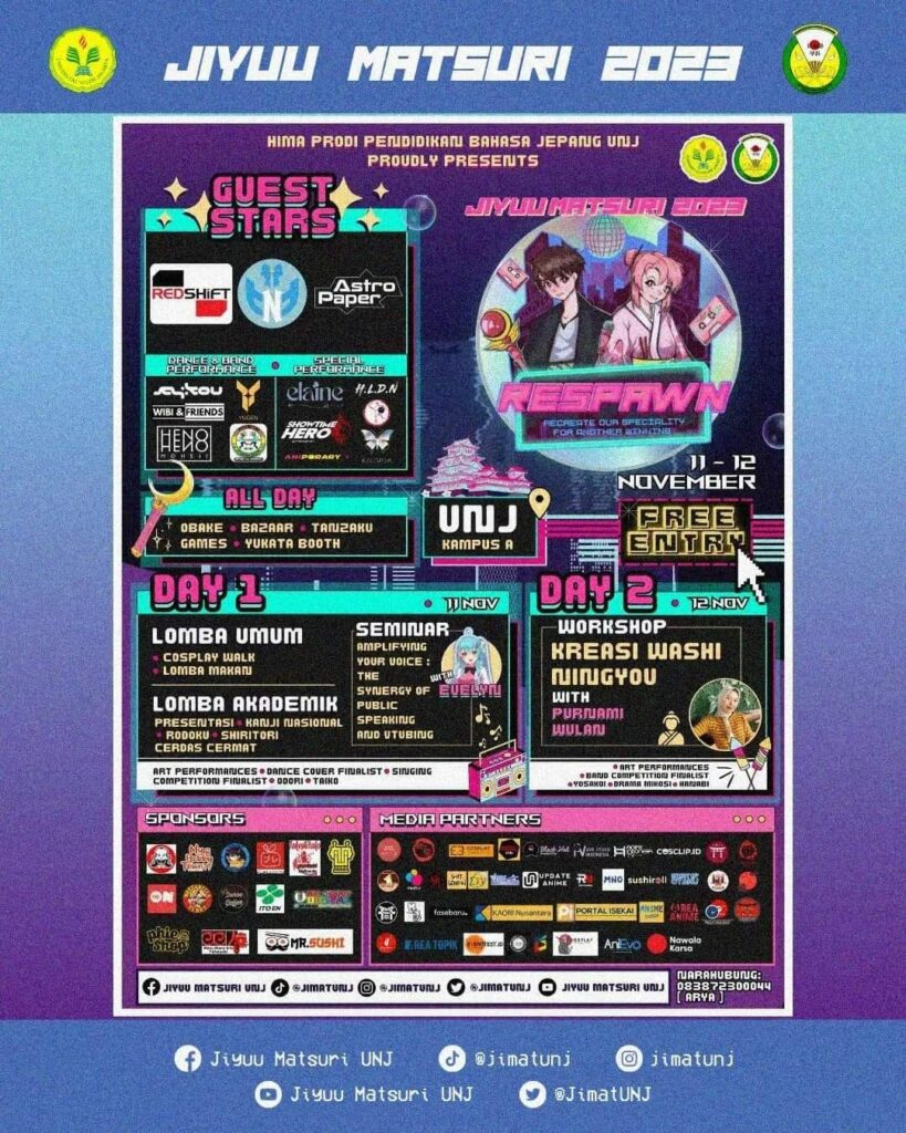 Jiyuu Matsuri 2023 tahun ini mengusung tema RESPAWN yang memiliki arti bangkit kembali. Jiyuu Matsuri kali ini membawa nuansa City Pop yang berlatarkan anime tahun 1980 dengan tema klasik. Kalian akan merasakan nuansa Jepang pada tahun 1980 yang bercampur dengan nuansa retro.