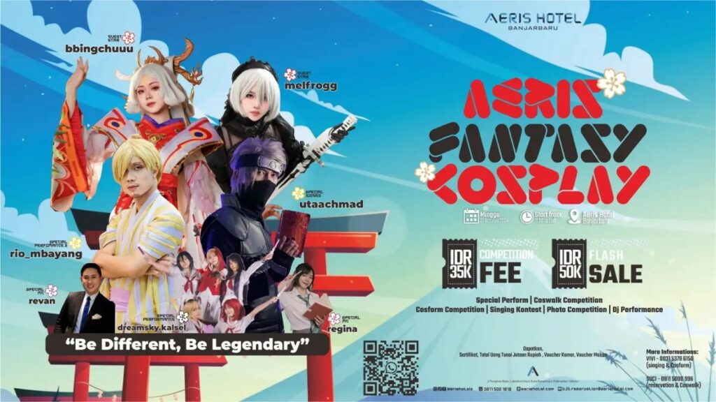 Bergabunglah bersama kami dalam acara paling dinanti tahun ini, di mana kreativitas dan hiburan bertemu! Ayo tunjukkan bakatmu dan ekspresikan diri melalui cosplay di Aeris Hotel Banjarbaru!