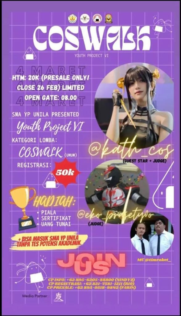 Di Youth Project kali ini, akan ada cabang lomba COSWALK dan terbuka untuk umum!! Menghadirkan Judges, Guest Star, dan MC yang superrr keren lhoo~