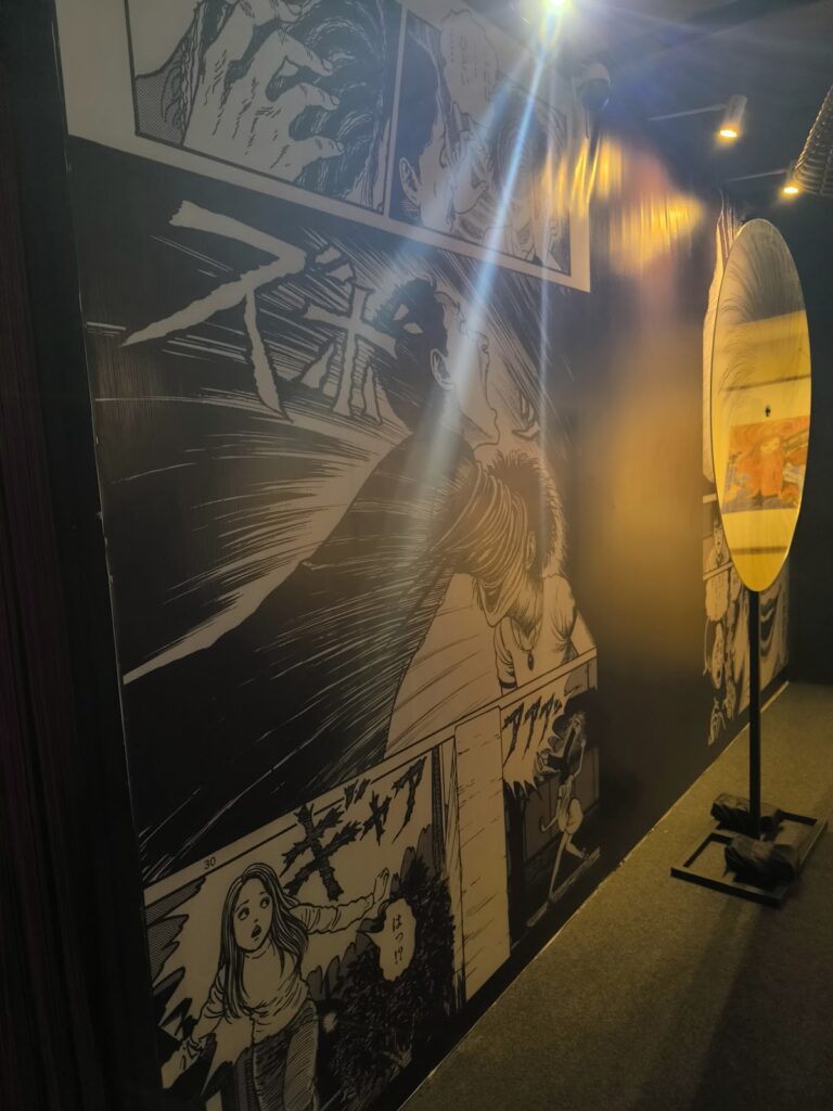 Selesai dari hall A/B, peserta langsung mengarah ke exhibition dan dapat mengembalikan tali dan bernapas lega. Ada yang tertawa, masih takut, dan juga ingin masuk lagi. Sesuai dengan judulnya, Junji Ito Showcase, area ini dipenuhi dengan karya-karya yang terbagi di dua tempat. Area hitam dan putih. Area hitam di isi dengan visi misi, sketsa, proses, dan penjelasan singkat dari Junji Ito. Ada juga cuplikan anime yang saat ini masih tayang di netflix dengan judul “Junji Ito Maniac : Japanese Tales of the Macabre”.