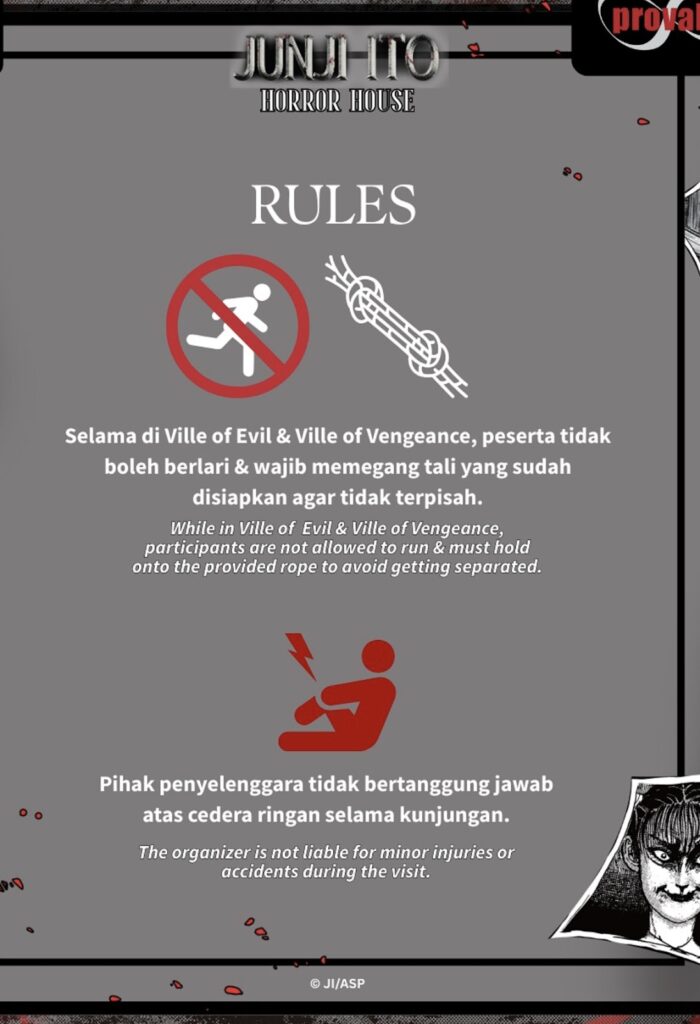 Peraturan yang harus diikuti adalah saat memasuki hall tidak boleh sendirian, maka diputuskan bahwa minimal 4 orang dan maksimal 6 orang, bila terlanjur memiliki lebih dari enam orang, bisa memberitahui panitia untuk memastikan apakah boleh tetap masuk atau harus memecah rombongan. Bila ingin membawa kamera, hanya boleh melakukan swafoto di area hall C, tidak boleh membawa senjata tajam, dan dilarang membawa balita, namun peserta di bawah 13 tahun harus didampingi oleh orang tua. Di dalam Ville of Evil dan Ville of Vengeange, peserta tidak boleh berlari maupun berjalan terlalu lambat, dan juga harus selalu memegang tali yang disediakan.