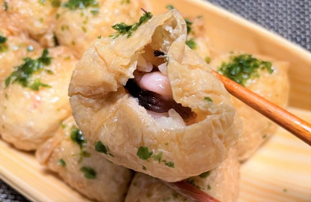 Seperti yang sudah kalian duga, Tako Chibi Inari adalah perpaduan dari dua makanan populer takoyaki dan inarizushi, yang memiliki bagian luar yang renyah dan panas, setiap potongan dibungkus dalam kulit tahu goreng berbumbu yang teksturnya kenyal, dingin, dan asin.