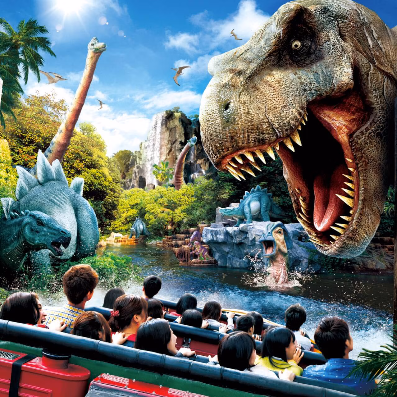 - Jurassic Park – The Ride: Perjalanan menegangkan dengan perahu menyusuri hutan yang dihuni dinosaurus dan diakhiri dengan terjunan besar.