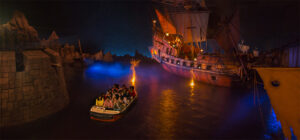 - Pirates of the Caribbean (Adventureland): Wahana perahu yang membawa pengunjung menjelajahi dunia bajak laut animatronik yang sangat detail.