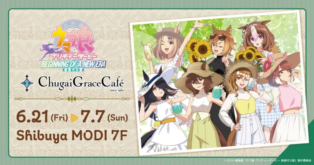 Game seluler paling populer di Jepang mendapat kolaborasi film dan kafe baru! Di acara Uma Musume: Pretty Derby – Door to a New Era x Chugai Grace Cafe, para penggemar akan disajikan makanan dan minuman yang terinspirasi oleh tujuh karakter Uma Musume dalam film tersebut. Pelanggan yang memesan dari menu kolaborasi juga akan menerima hadiah kejutan! Setiap pembelian merchandise senilai ¥3.000 juga akan mendapatkan satu dari tujuh kartu ilustrasi yang dipilih acak.