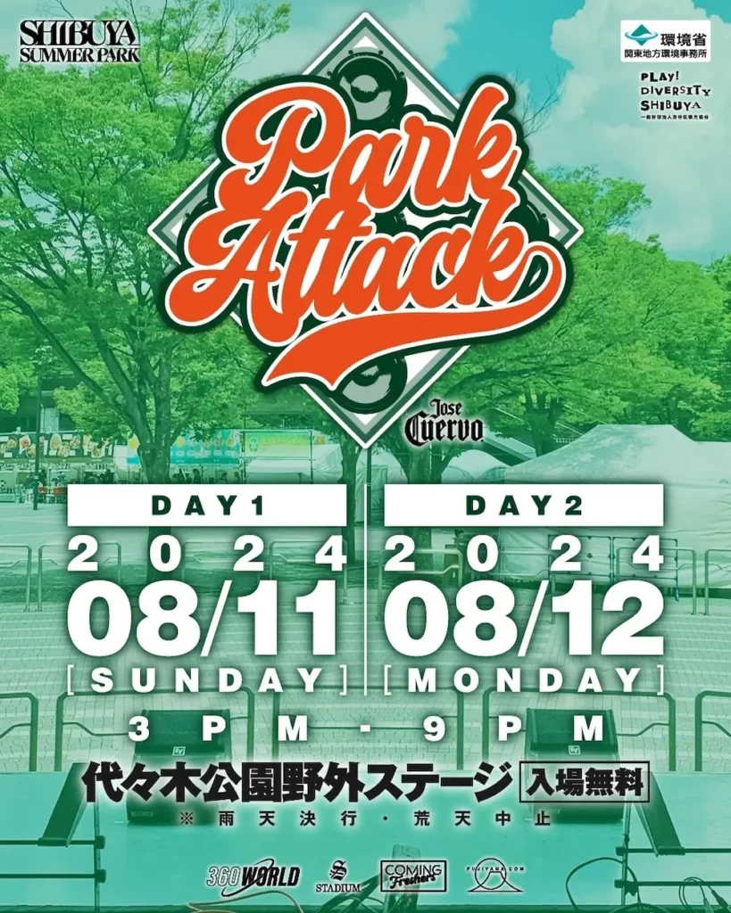 Diselenggarkan bersamaan dengan Shibuya Summer Park Festival, sebuah festival gratis di sekitar Shibuy yang berfokus pada seni, makanan, dan budaya. Park Attack menampilkan jajaran nama-nama penting dalam kancah rap yang dikurasi khusus. Acara ini berlangsung selama dua hari.