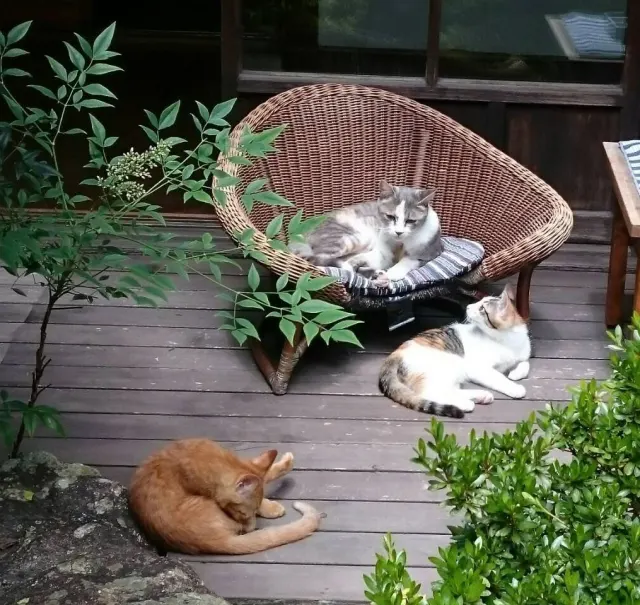 Ketiganya awalnya adalah kucing liar yang tinggal di sekitar penginapan, hingga akhirnya diadopsi dan diberi rumah di sini. Bahkan, pemilik penginapan ini membuka kafe kucing penyelamat di sebelah penginapan, yang kini menjadi rumah bagi 13 kucing lain dengan kepribadian yang khas.