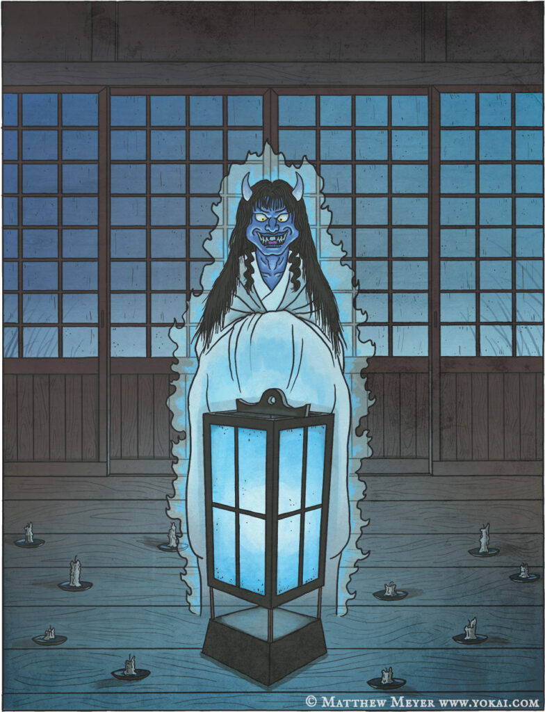 Ao Andon muncul dari kisah Hyakumonogatari Kaidankai, permainan memanggil roh dengan menyalakan 100 lentera dan menceritakan kisah hantu. Setelah lentera terakhir padam, Ao Andon dikatakan akan muncul: wanita berjubah biru, bermata menyeramkan, dan dikelilingi cahaya kebiruan. Ia jadi simbol bahwa batas dunia manusia dan roh telah terbuka.