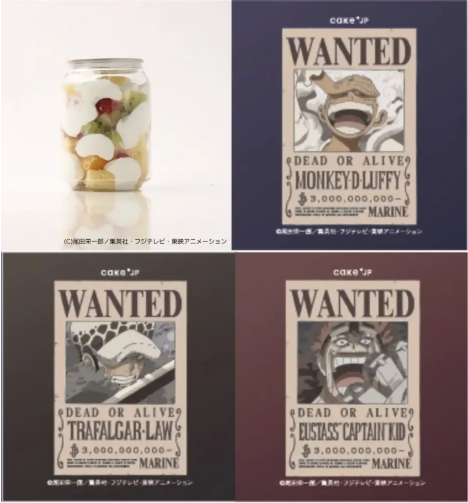 Semua kue ini dijual dengan harga 1.000 yen dan 10 kue di atas juga tersedia secara daring di toko web Cake.jp. Namun, khusus kue Luffy Gear 5 (grape sundae) hanya tersedia di vending machine bersama tiga kue poster buronan yang djual dalam format gacha. Berikut adalah visualnya.