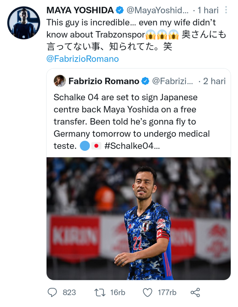 Maya Yoshida pun terheran-heran dengan kabar yang diumumkan oleh Fabrizio Romano, terutama tentang tawaran dari Trabzonspor yang bahkan istrinya pun tidak tahu. Dia me-retweet postingan Fabrizio dan memberikan tanggapan berupa pujian kepada Fabrizio. Dia pun menambahkan, bahwa istrinya tidak mengetahui info tentang Trabzonspor.