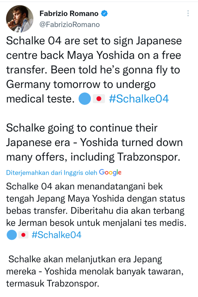 Fabrizio Romano mengabarkan, jika Maya Yoshida telah bergabung ke Schalke, Senin (4/7). Sang pemain telah menolak beberapa tawaran dari klub lain, salah satunya Trabzonspor, klub asal Turki.