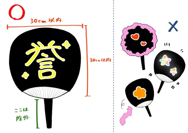 Ada yang mengatakan bahwa beberapa acara memiliki peraturan yang berlaku untuk para penonton. Tertanda ada tulisan yang mengatakan bahwa saat melambaikan tongkat, atau kipas, di sekitar, Anda harus menjaga ujung atas setinggi bahu atau lebih rendah.