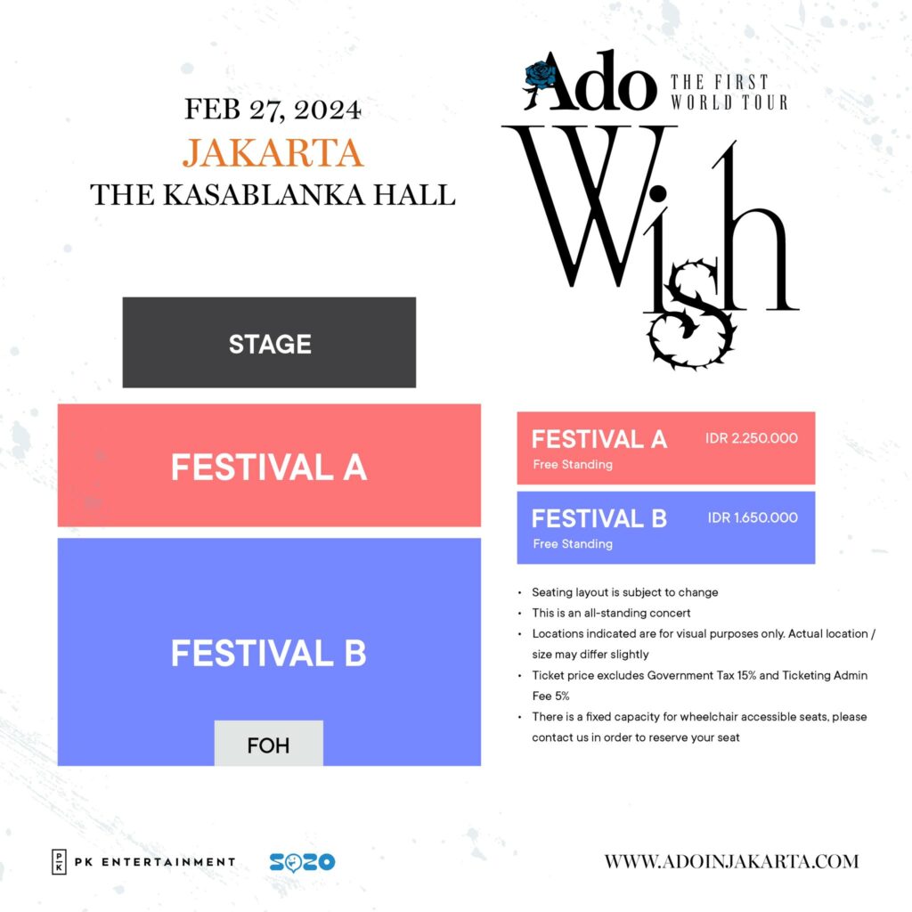 PK Entertainment dan Sozo selaku promotor konser ini juga telah mengumumkan harga tiket untuk konser Ado ini. Tiket dijual dalam dua kategori, yakni Festival A dan Festival B.