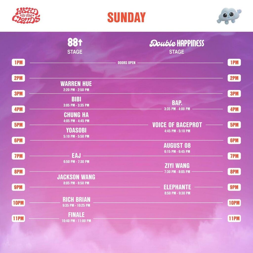 Jangan sampai ketinggalan penampilan YOASOBI atau artis favorit. YOASOBI sendiri bakalan tampil pada hari Minggu (2/12) pkl. 17:10-17:50. Berikut adalah jadwal Head in the Clouds