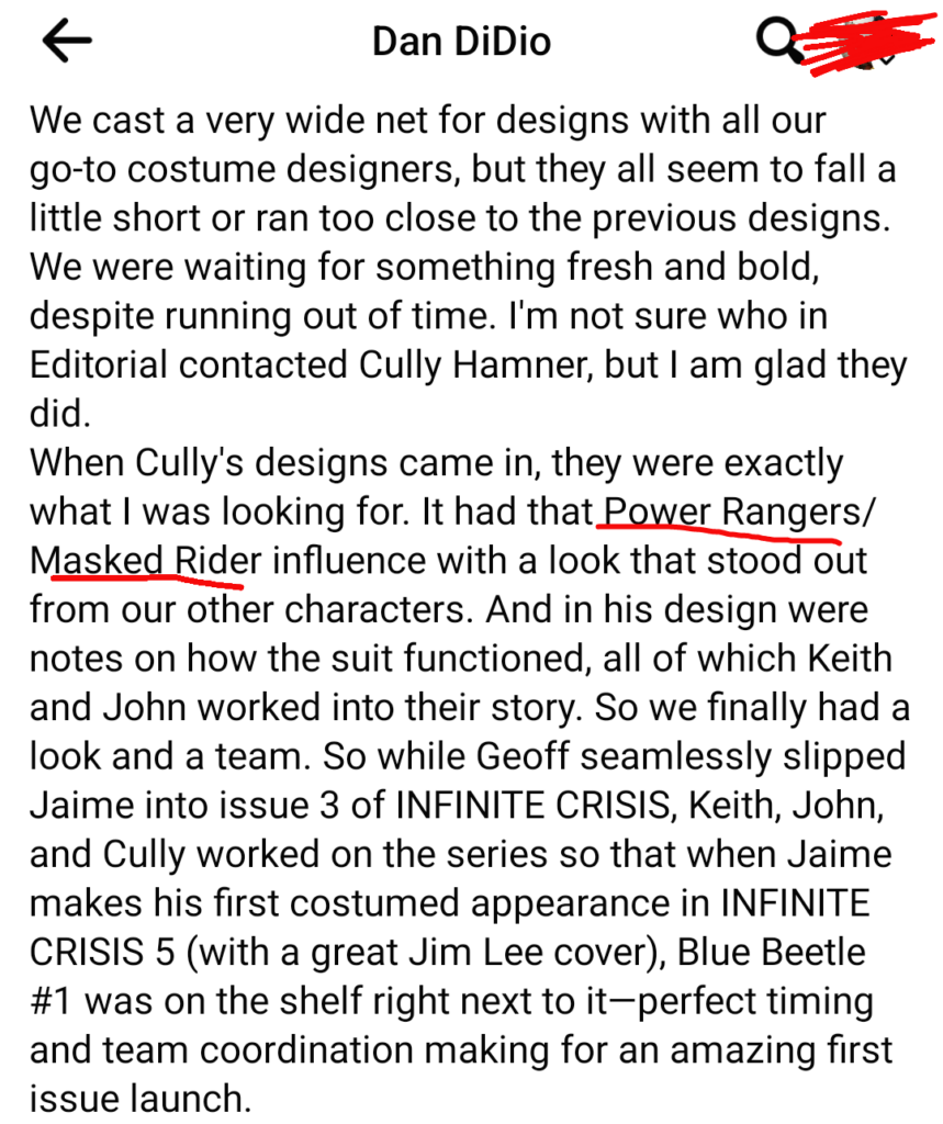 Hal ini kemudian diamini oleh Dan DiDio, salah satu staff di DC Comics. Dalam sebuah postingan di Facebook-nya, dia menceritakan latar belakang karakter Blue Beetle versi Jaime Reyes tercipta.