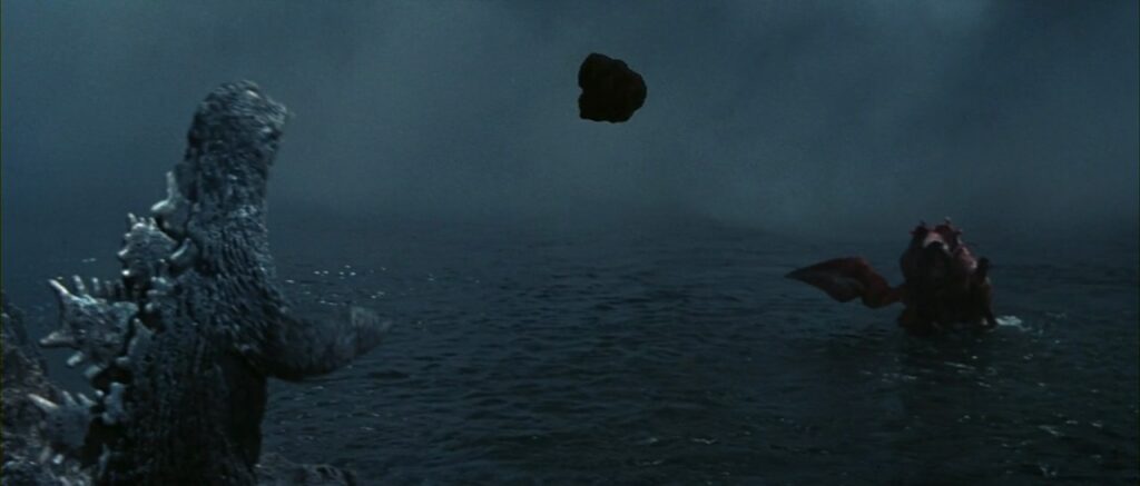 Kembali lagi kita melihat dua monster yang saling lempar batu bak sedang bermain voli di tepi pantai. Salah satu adegan aksi-komedi yang sepertinya sudah menjadi formula pasti film-film Godzilla di tahun itu. Sayang pertarungan ini terlalu pendek padahal Ebirah adalah si bintang utama, tapi Godzilla memang superior.
