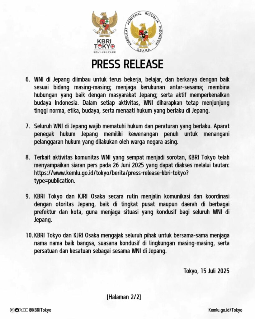 “KBRI Tokyo dan KJRI Osaka mengajak seluruh pihak untuk bersama-sama menjaga nama baik bangsa, suasana kondusif di lingkungan masing-masing, serta persatuan dan kesatuan sebagai sesama WNI di Jepang.”