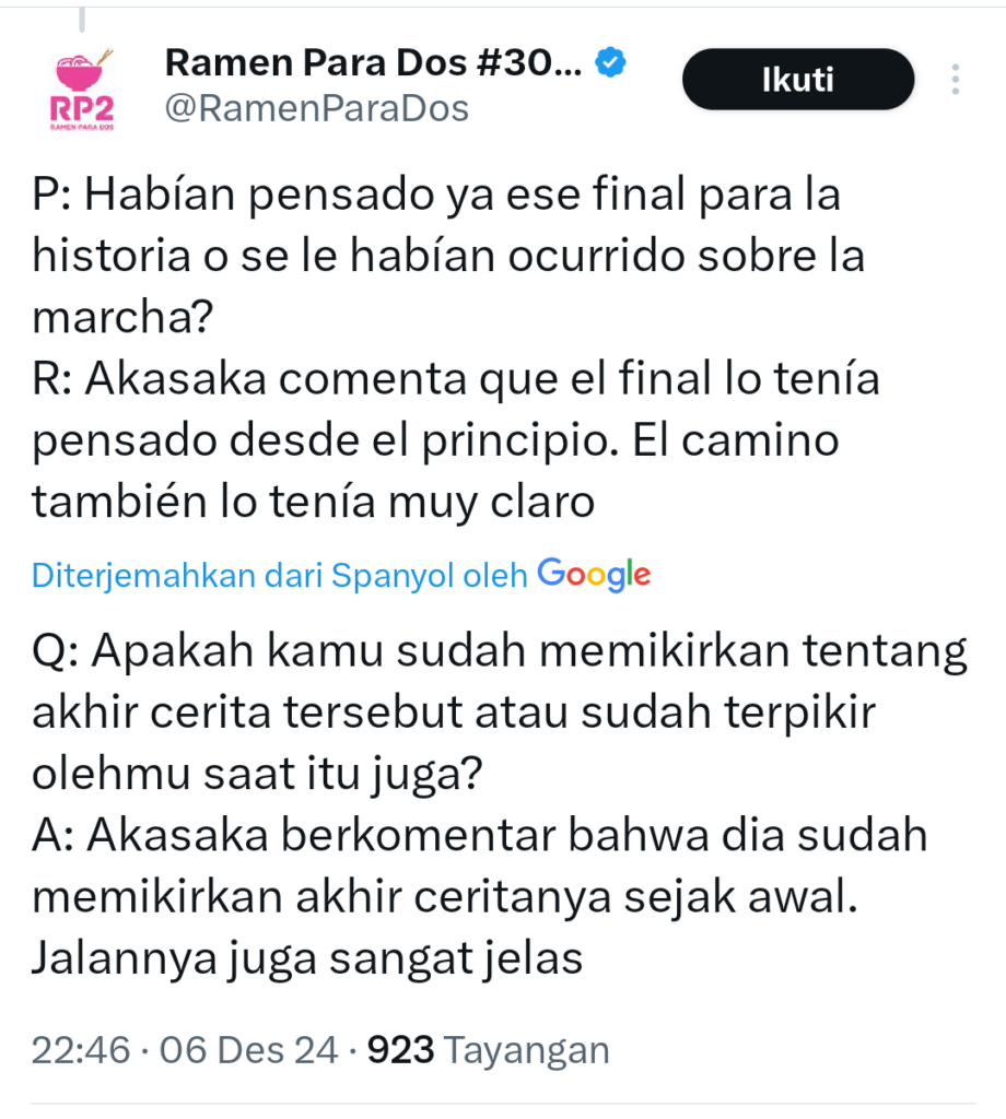 Hal ini seperti dia ungkapkan pada event Manga Barcelona (Sabtu, 7 Desember 2024) yang digelar di kota Barcelona, Spanyol. Seperti dikutip Ramen Para Dos, Mengo Yokoyari bersama Aka Akasaka, penulis cerita Oshi no Ko hadir dalam acara tersebut untuk di-interview.
