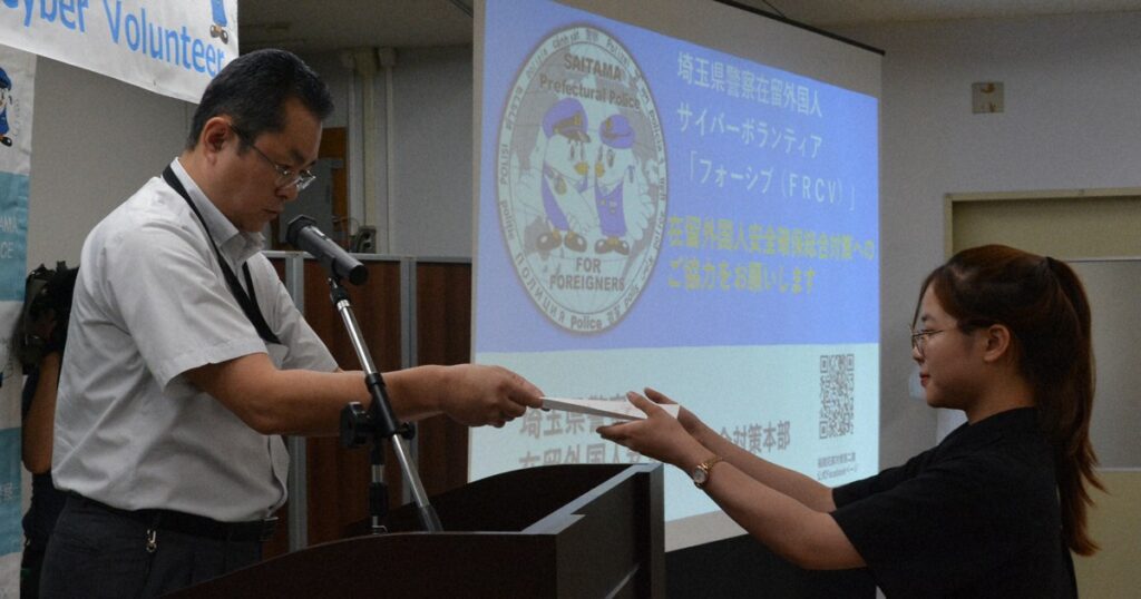 Seorang relawan menerima sertifikat registrasi dari kepala departemen urusan kriminal Kepolisian Prefektur Saitama, Takehiro Sugatani, di Distrik Urawa, Kota Saitama pada 19 Juli 2024. (Mainichi)