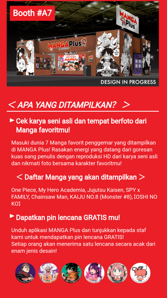 Mangaplus juga membuka booth yang bisa dikunjungi oleh pengunjung dari tanggal 3 sampai 5 Mei. Booth tersebut menampilian 7 manga favorit penggemar, yakni One Piece; My Hero Academia; Jujutsu Kaisen; SPY x Family; Chainsaw Man; Kaiju No. 8; Oshi no Ko. Booth berlokasi di A7.