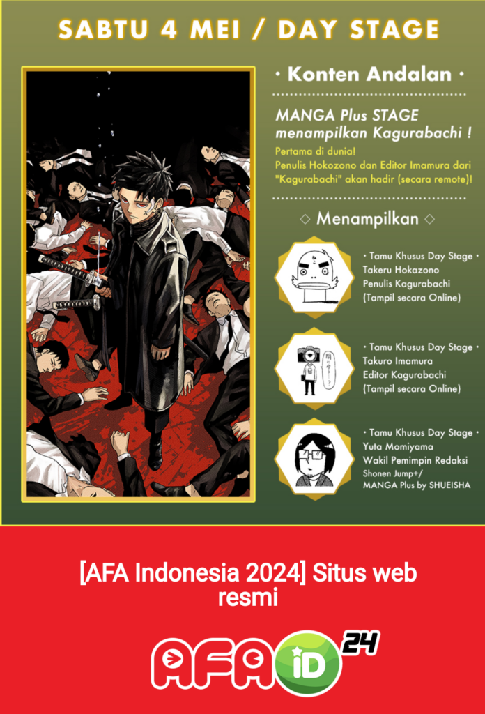 AFA Indonesia dijadwalkan digelar pada 3-5 Mei di Jakarta Convention Center. Mangaka Takeru Hokazano akan tampil secara online di Mangaplus stage tanggal 4 Mei. Mangaplus merupakan layanan baca manga milik Shuiesha.