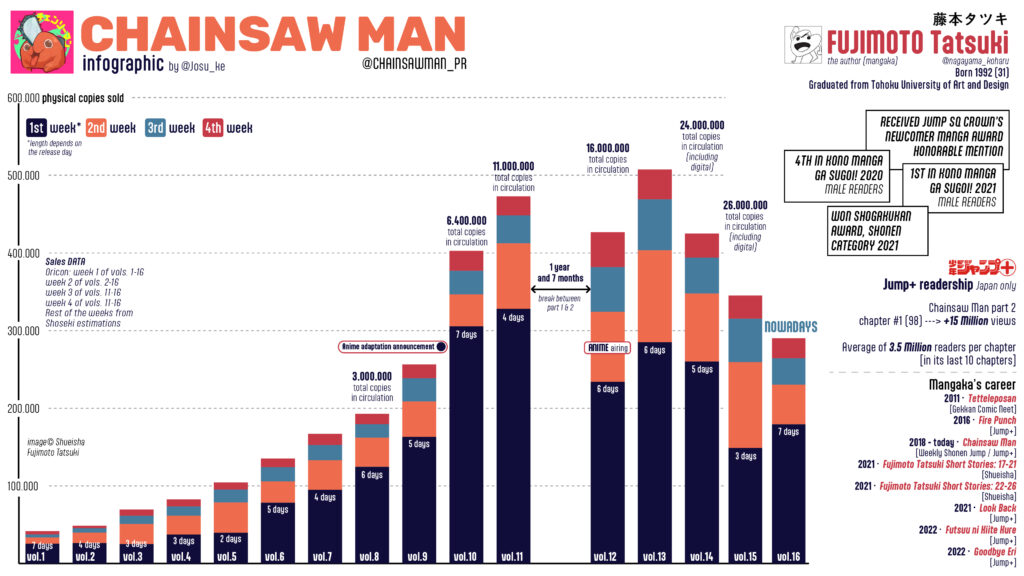 Meskipun grafik hanya menggambarkan penjualan manga fisik Chainsaw Man di Jepang, penting untuk dicatat bahwa jumlah pembaca secara keseluruhan kemungkinan besar tetap besar berkat platform digital Jump+. Jadi total keterlibatan tidak sepenuhnya ditunjukkan oleh angka volume cetak saja pada tahap ini.