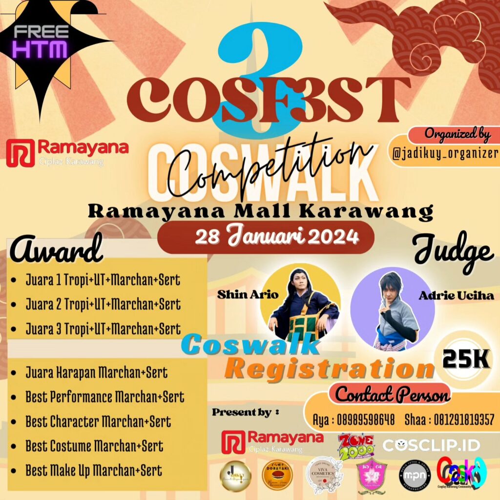 Setelah sukses menjalankan event COSFESTONE dan COSFEST#2 kali ini JadiKuy! Organizer x Ciplaz Mall Karawang akan mempersembahkan: