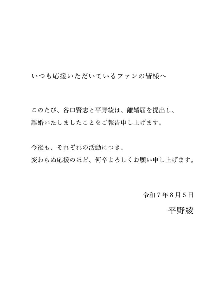 Seiyuu sekaligus aktris dan penyanyi Aya Hirano mengumumkan perceraiannya dari aktor Masashi Taniguchi melalui sebuah surat resmi yang ditujukan kepada para penggemarnya pada tanggal 5 Agustus 2025.