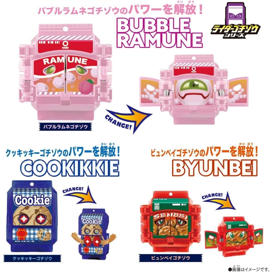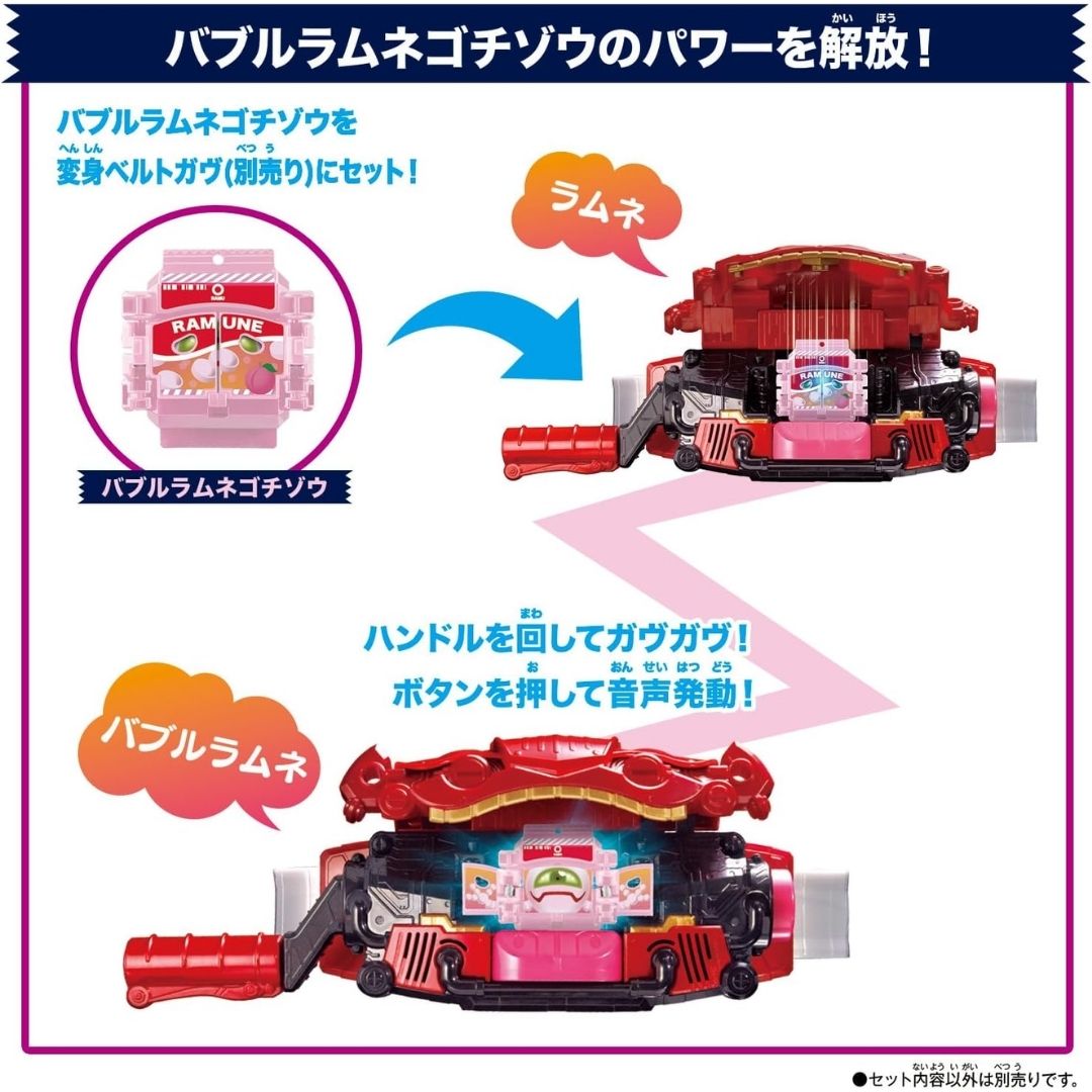 Kamen Rider Gavv Gochizo Set DX Series 3 menghadirkan tiga item unik: Bubbleram Negolphan, Cookie Gourd, dan Bungbei Gypsophila. Gunakan bersama Sabuk Transformasi DX Gavv (dijual terpisah) untuk memicu perubahan form dan efek khas dari masing-masing item.