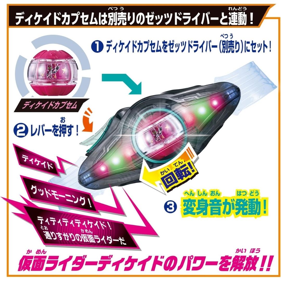 Masukkan kartu Zezt ke dalam Zeztz Camera dan lihat gambar unik muncul di balik lensa! Putar kapsulnya untuk mengganti pola dan temukan keseruan berbeda di setiap sisi kartu. Nikmati juga pengalaman interaktif saat Decade Capsule disambungkan ke Transformation Belt DX Zezt Driver (dijual terpisah) untuk mengaktifkan suara dan cahaya khas setiap Rider.