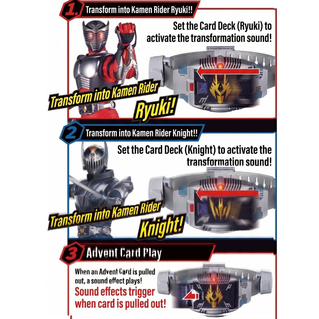 Transformasi seperti Kamen Rider Ryuki dengan DX V Buckle dari Super Best Series. Dilengkapi kartu Advent dan efek suara khas yang membuat pengalaman bermain semakin realistis.