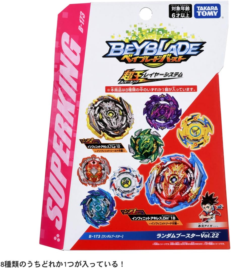Beyblade Burst Random Booster Vol. 22 B-173 adalah paket berisi Beyblade yang dipilih secara acak. Setiap paket berisi satu Beyblade lengkap yang terdiri dari layer, disc, dan driver.