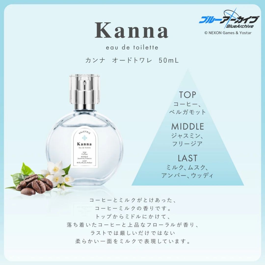 Blue Archive Canna Eau de Toilette 50mL menghadirkan aroma coffee & milk hangat dengan top notes kopi dan bergamot, heart notes jasmine & freesia, serta base notes milk, musk, amber, dan woody. Botol elegan praktis untuk penggunaan sehari-hari maupun dekorasi.