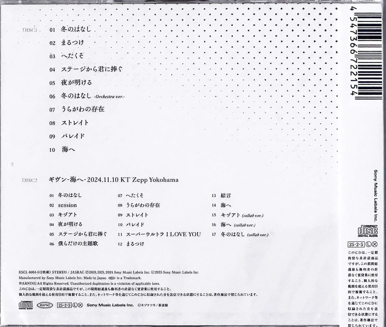 CD: DISC2 Sumber Suara Live Rasakan energi panggung dari konser GIVEN – TO THE SEAS- pada 10 November 2024 di KT Zepp Yokohama dengan rekaman live yang memukau: 01 Winter Nothing 02 session 03 Kizuato 04 Dawn 05 From Stage to You 06 Our Exclusive Subject Song 07 navel button 08 Enthusiasts. 09 Straight 10 parade 11 Super Ultra I Love You 12 Round Tsuki 13 Quotations 14 To the Sea 15 collab ver.) 16 collab ver.) 17 collab ver.)